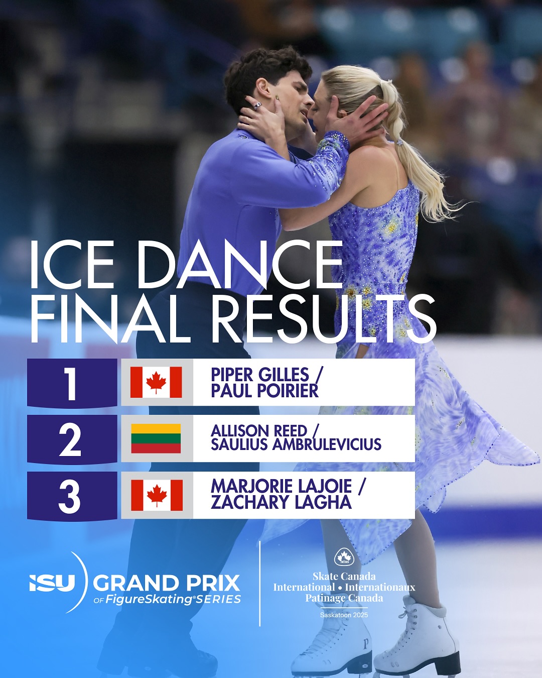Канадские танцоры на льду Пайпер Гиллес и Поль Пуарье (Piper GILLES / Paul POIRIER) по сумме баллов за оба танца победили на 3-м этапе Гран-при в Саскатуне, Канаде, (202.89). Многие фигуристы перед Олимпиадой берут свои старые, на их вгляд, самые удачные программы, забывая, что отчасти их прелесть была в новизне. Так и обладатели золотых медалей этого турнира повторили свой произвольный танец сезона 2018-2019 Vincent (посвященный Винсенту ван Гогу), и проиграли произвольный танец фигуристам из Литвы.
