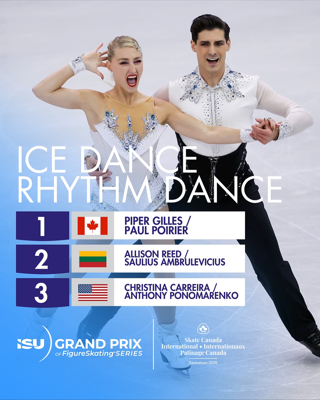 Канадский танцевальный дуэт Пайпер Гиллес – Поль Пуарье (Piper GILLES / Paul POIRIER) лидирует после ритм-танца на 3-м этапе Гран-при в Саскатуне, Канаде, (85.38).