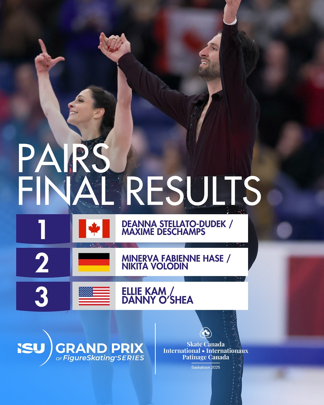 В Саскатуне, Канаде на 3-м этапе Гран-при по фигурному катанию по итогам двух программ победили канадцы Деанна Стеллато-Дудек и Максим Дешам (Deanna STELLATO-DUDEK / Maxime DESCHAMPS), (213.40).