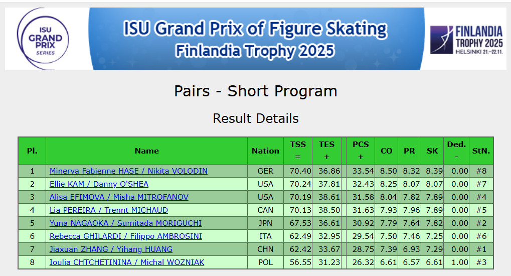 Гран-при, Finlandia Trophy, 2025, Финляндия, Хельсинки. Пары, короткая программа