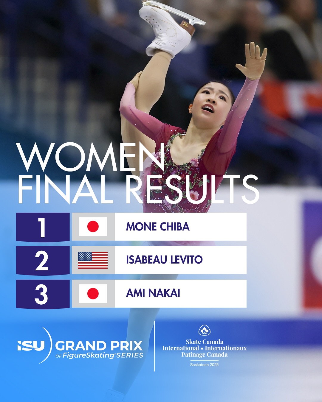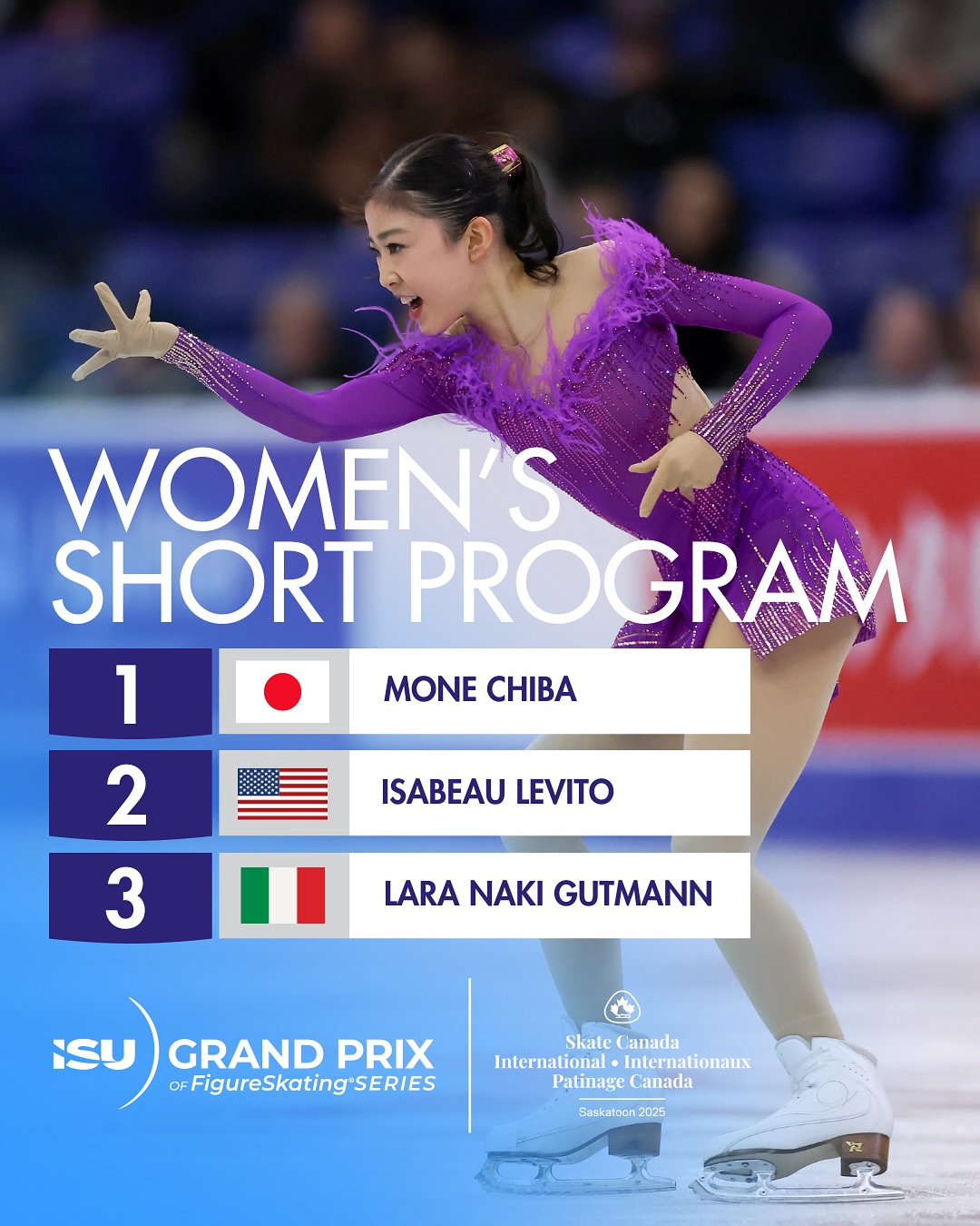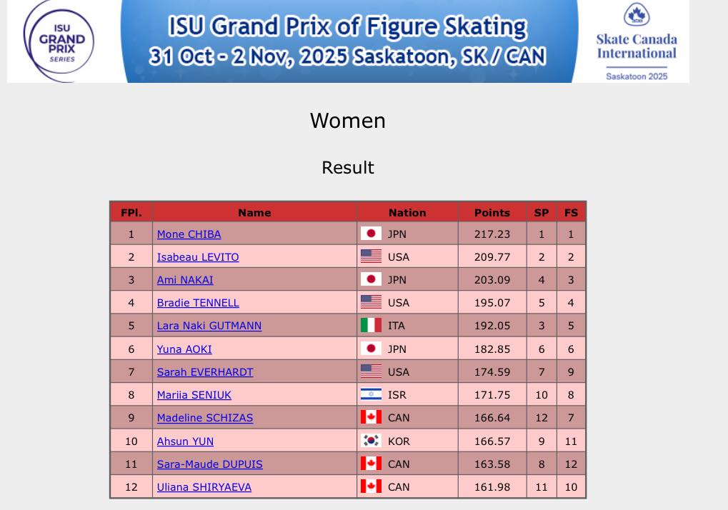Японка Моне Чиба (Mone CHIBA) выиграла короткую программу на 3-м этапе Гран-при в Саскатуне, Канаде, (72,29).
