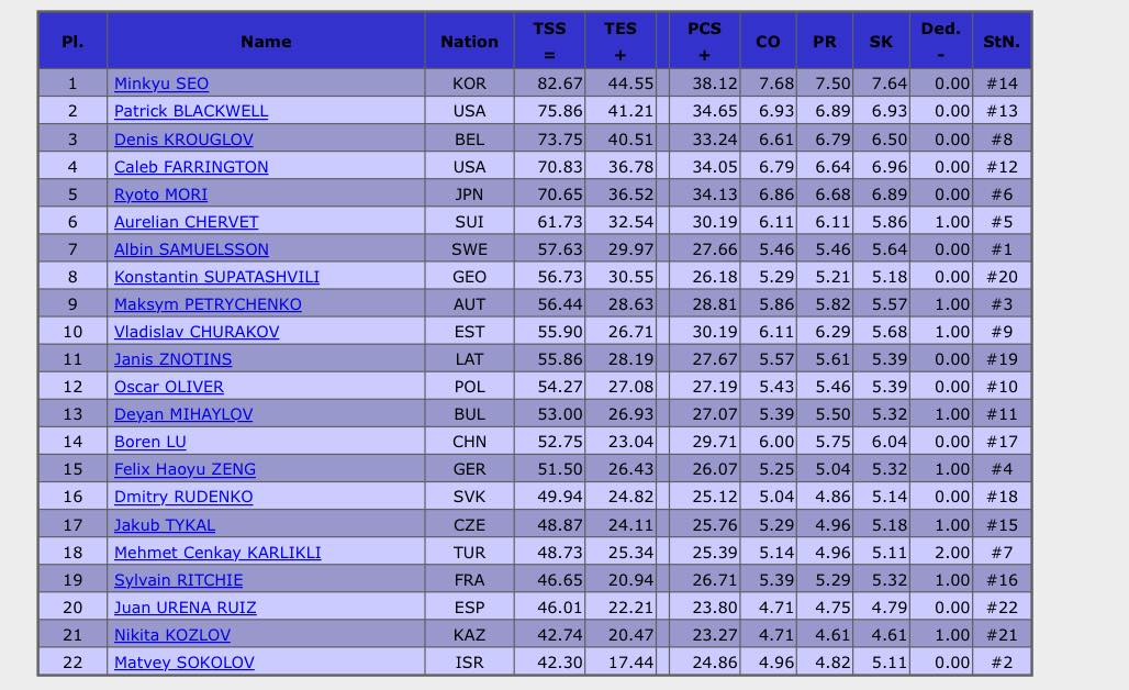 Фигурист из Бельгии Денис Круглов (Denis KROUGLOV) –третий (73,75). Хороший чистый прокат короткой программы. Очень артистичный парень!