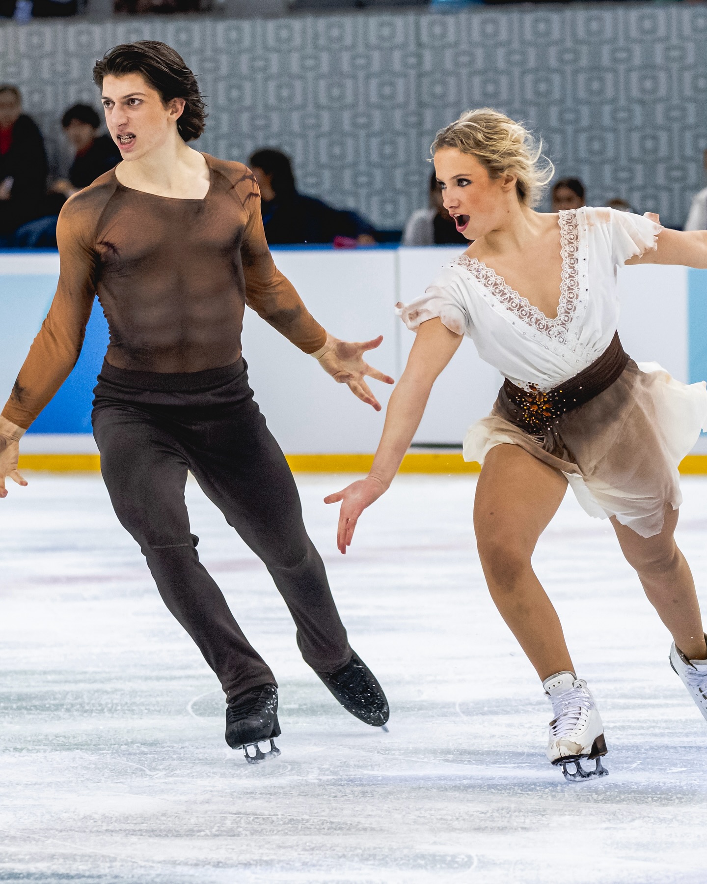 Фигуристы из Италии Зои Бьянки и Даниэль Базиль (Zoe BIANCHI / Daniel BASILE) – с бронзовыми медалями третьи, (146,42). Красивый произвольный танец, откатали чисто, интересные поддержки, переходы, но мне немного не хватило скорости скольжения. Скажем так, музыка обязывает, особенно, если это “Лунная соната” Бетховена.