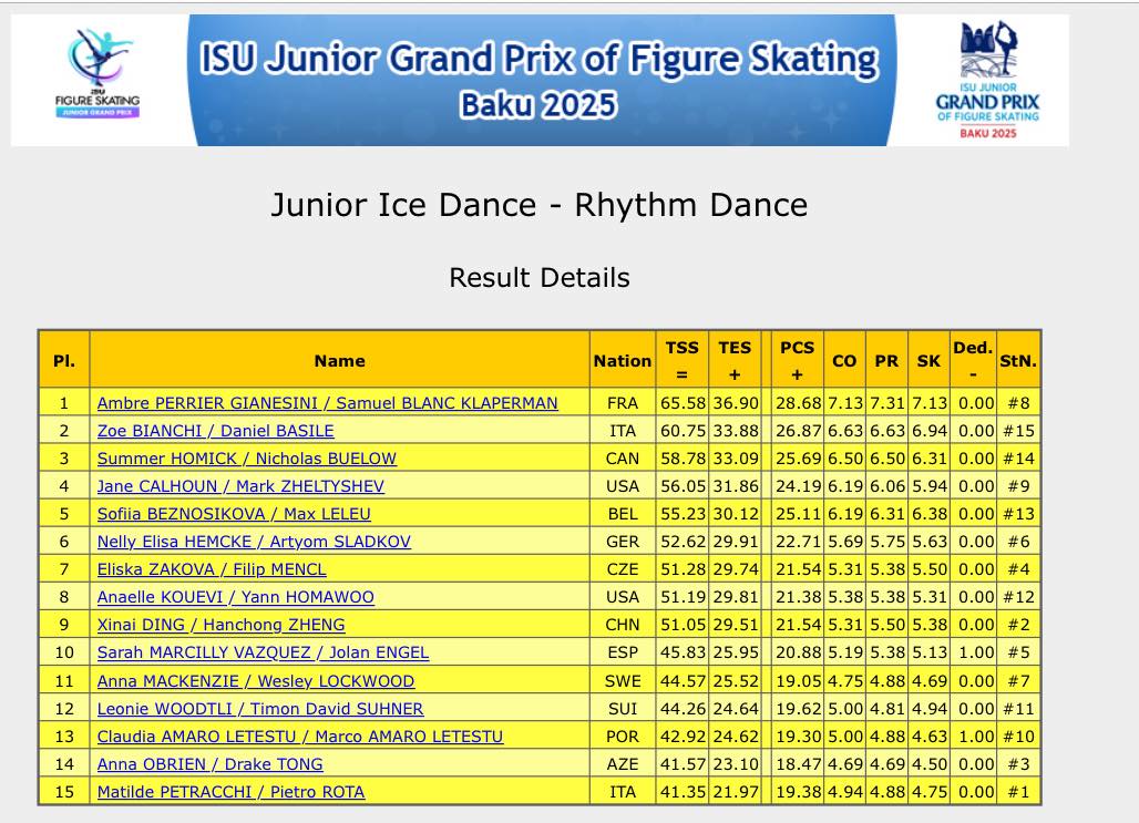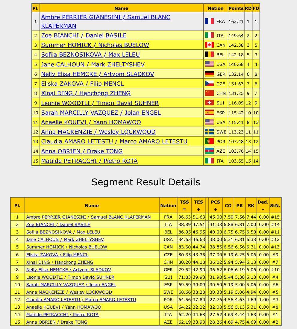 После исполнения ритм-танца лидируют французы Амбр Перрье-Джанезини и Самюэль Бланк-Клаперман (Ambre PERRIER GIANESINI / Samuel BLANC KLAPERMAN), (65,58). Хорошо откатали ребята свой короткий танец! Партнерша – секси и партнер с элементами брейк-данса, намешано много, но вместе с тем и твизлы в конце в проката, и поддержка в движении – все высшего 4-го уровня. И мне понравилось их рёберное скольжение, приятно было смотреть на них.