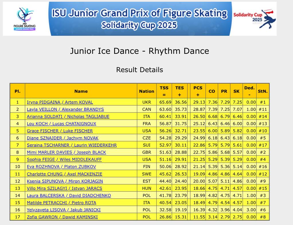 Соревнования второго дня 6-го этапа Гран-при среди юниоров в Гданьске открыли танцоры на льду.После исполнения ритм-танца лидирует украинцы Ирина Подгайная и Артем Коваль (Iryna PIDGAINA / Artem KOVAL), (65,69). Твизлы и вращательная поддержка 4-го уровня, молодцы!