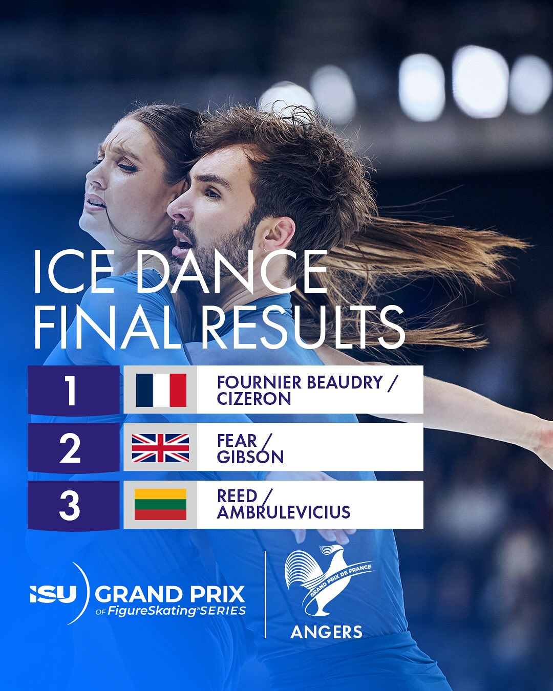 Танцоры на льду из Франции Лоранс Фурнье-Бодри и Гийом Сизерон (Laurence FOURNIER BEAUDRY / Guillaume CIZERON) одержали победу на 1-м этапе Гран-при по фигурному катанию Grand Prix de France во французском Анже, завоевав золотые медали, (211.02).