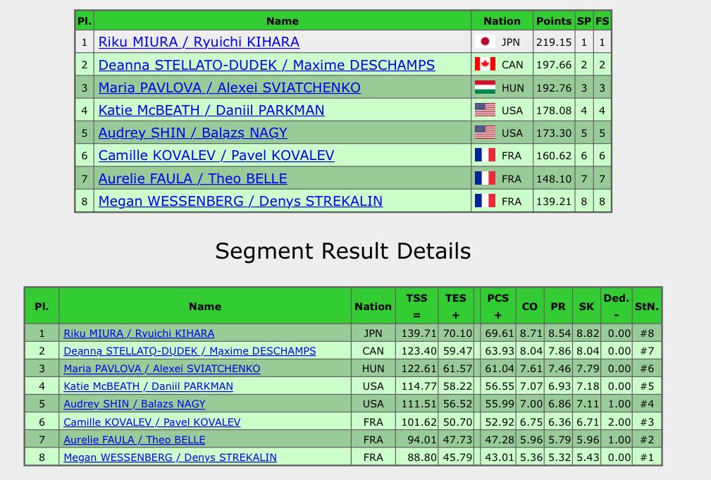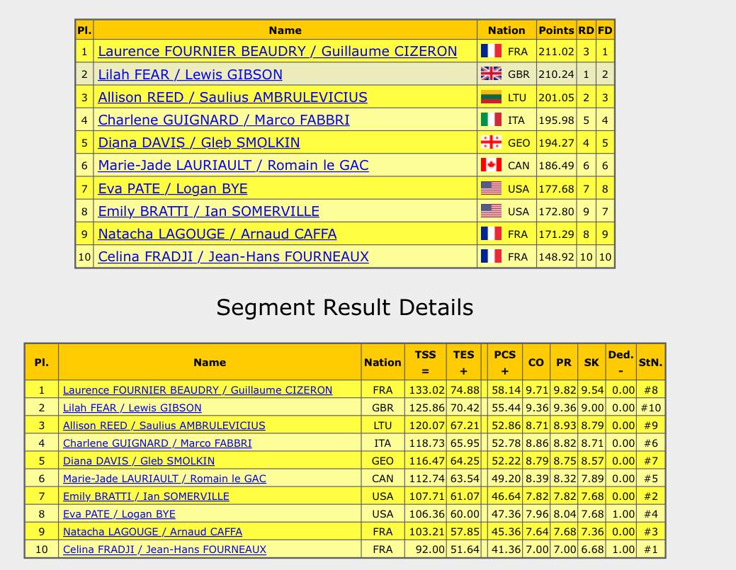Французы  Лоранс Фурнье-Бодри и Гийом Сизерон (Laurence FOURNIER BEAUDRY / Guillaume CIZERON) – на третьем месте, (78.00). Удачи тебе, Сизерон, с новой партнершей!