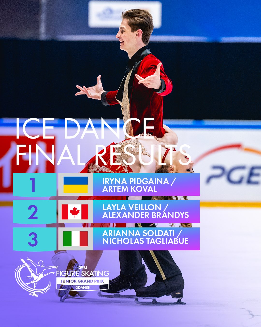 Победителями и обладателями золотых медалей в танцах на льду стали украинцы Ирина Подгайная и Артем Коваль (Iryna PIDGAINA / Artem KOVAL), (164.13). Хорошо откатали произвольный танец под музыку из “Moulin Rouge “.Канадцы Лейла Вейон и Александр Брэндис (Layla VEILLON / Alexander BRANDYS ) – с серебром на втором месте, (161.44).