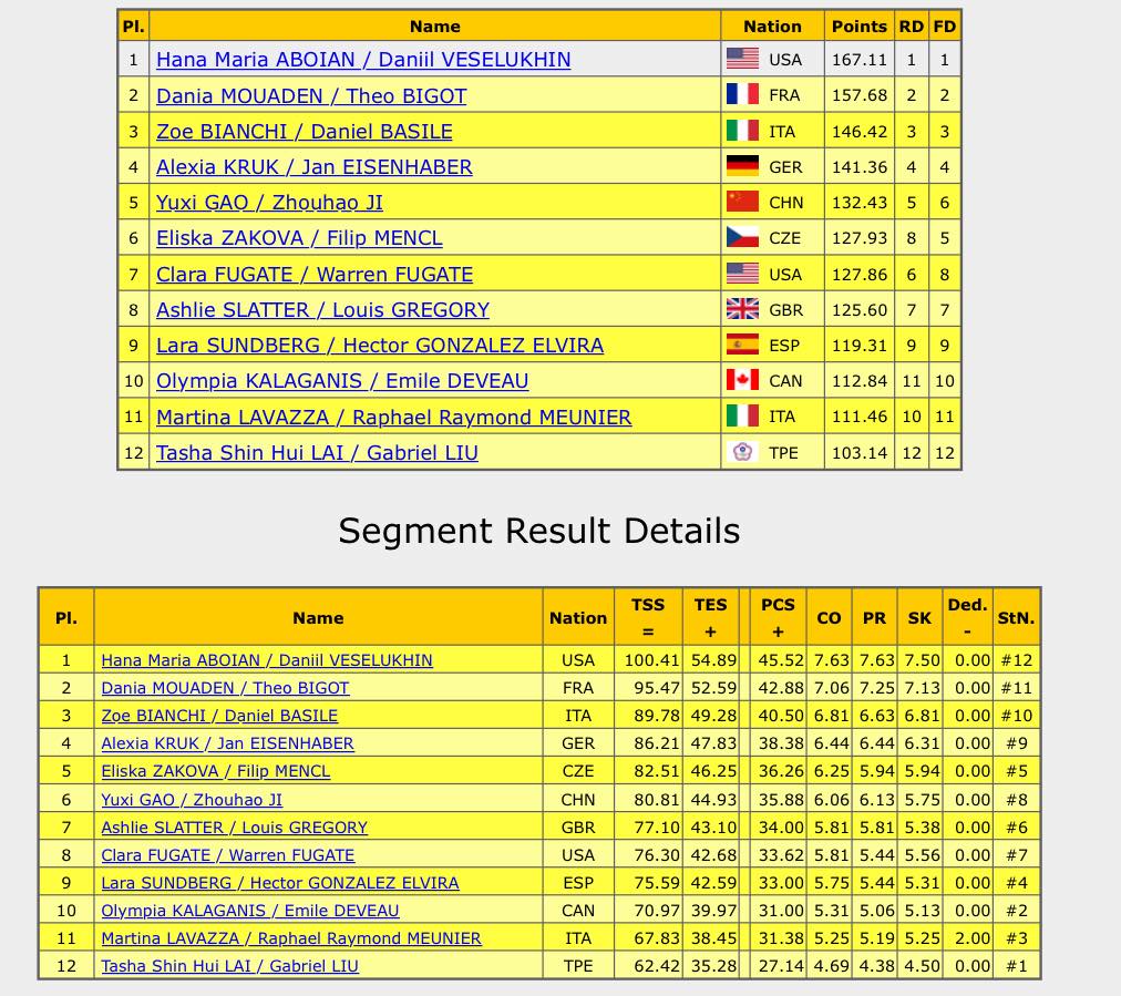 Французы Дания Муаден и Тео Биго (Dania MOUADEN / Theo BIGOT) – на втором месте (62,21). Хорошая пара у французов подрастает, твизлы тоже 4 уровня и очень интересная поддержка. Парнерша особенно понравилась!