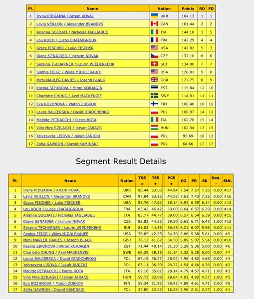 После исполнения ритм-танца лидирует американцы Хана Мария Абоян и Даниил Веселухин (Hana Maria ABOIAN / Daniil VESELUKHIN), (66,70). Хороший прокат под Мадонну, твизлы у обоих партнеров и вращательная поддержка высшего 4-го уровня, молодцы!