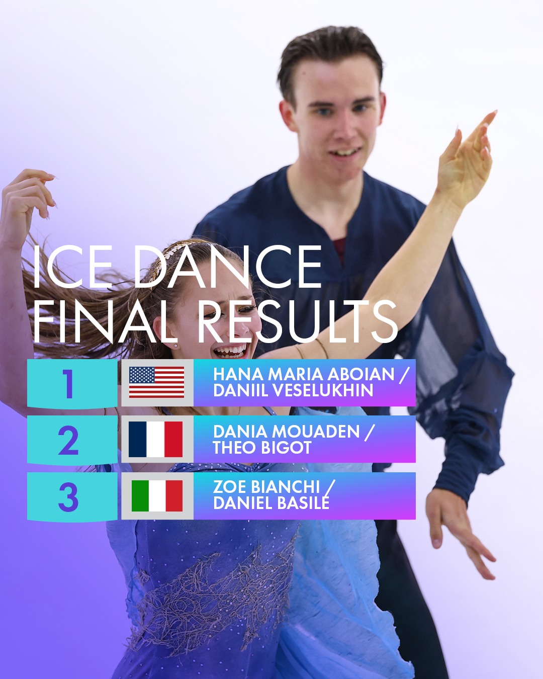 Победителями и обладателями золотых медалей в танцах на льду стали американцы Хана Мария Абоян и Даниил Веселухин (Hana Maria ABOIAN / Daniil VESELUKHIN), (167,11). Прекрасный прокат! Почти все основные элементы 4-го уровня! И как интересно придумали костюм для Ханы, олицетворяющей крылатую богиню Нику! Да и Даниил в образе скульптора хорош!