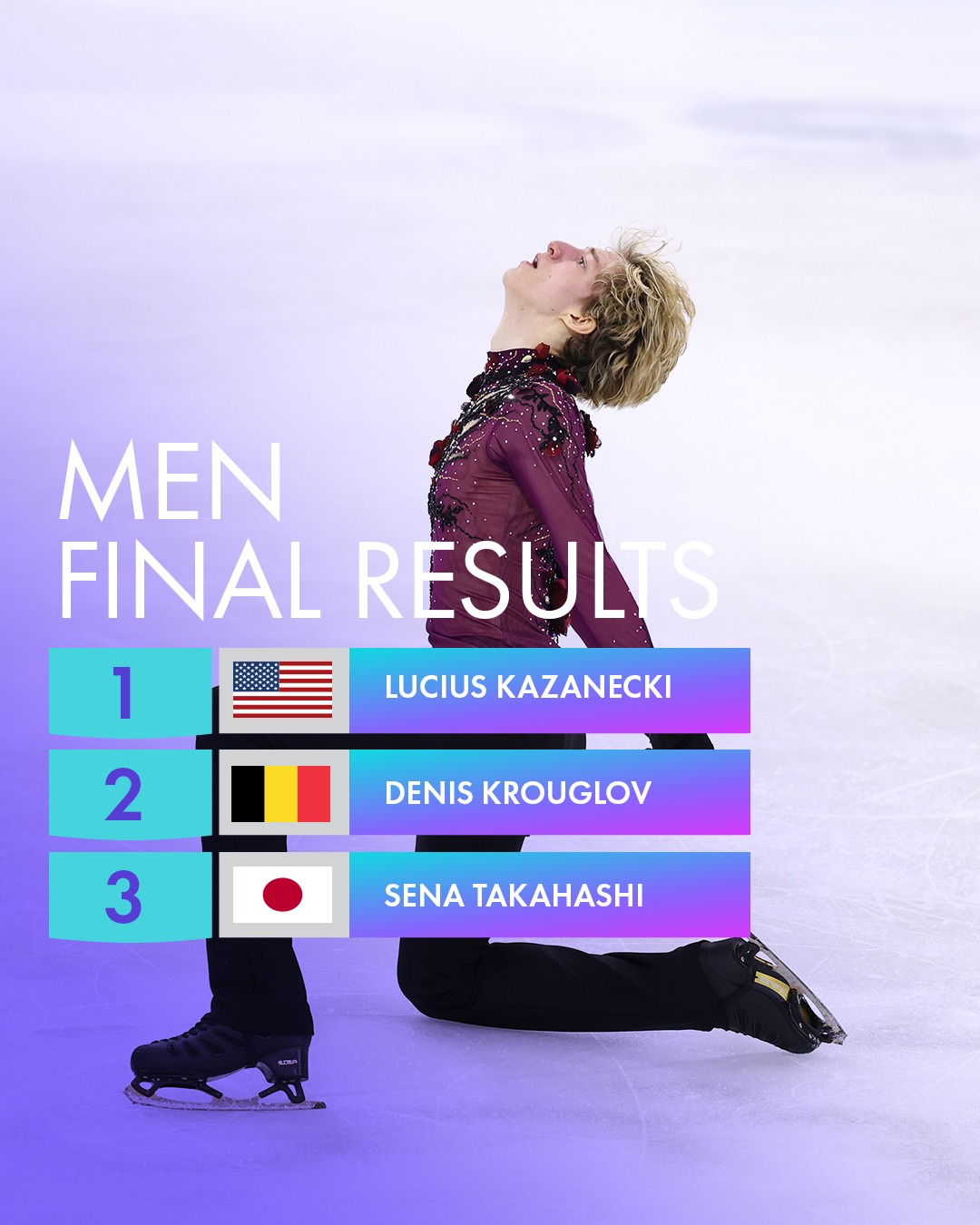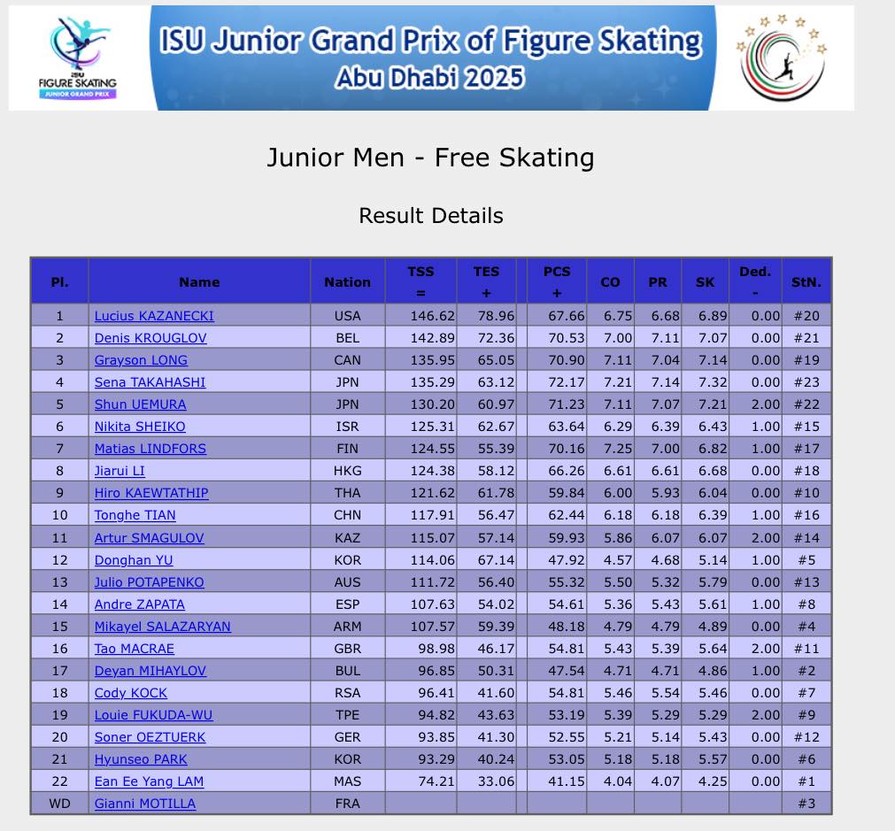 Юноши разыграли свой комплект медалей на 7-м этапе Гран-при по фигурному катанию среди юниоров в Абу-Даби.Американец Лусиус Казанеки (Lucius KAZANECKI) одержал победу, завоевав золотую медаль, (219,63). И это вполне оправданно при таком контенте: два четверных тулупа (4Т), один из которых в каскаде с тройным тулупом (4Т+3Т), плюс аксель в три с половиной оборота (3А), позволили Лусиусу подняться с 4-го места после короткой программы на верхнюю ступень пьедестала. Молодец!