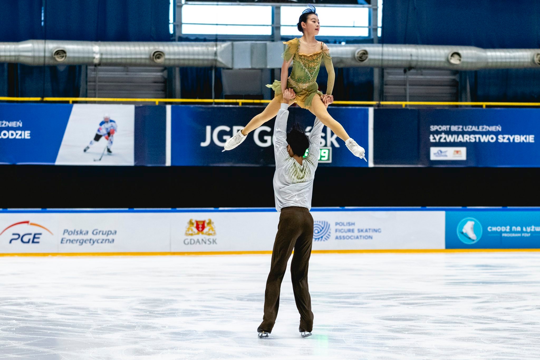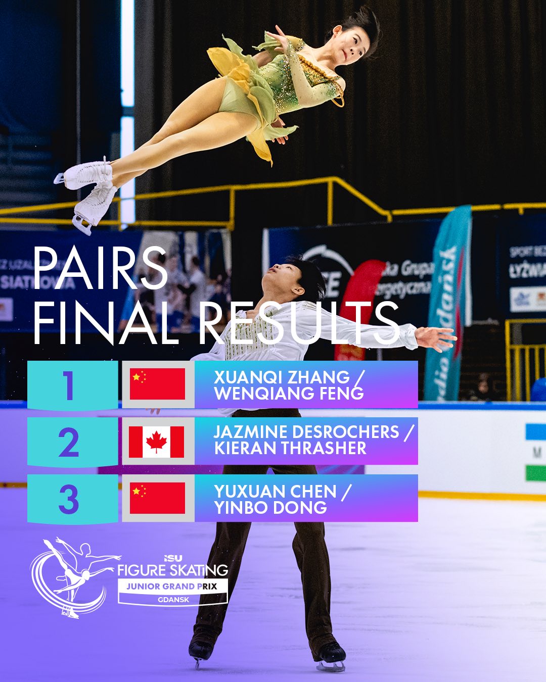 Спортивные пары разыграли первый комплект медалей 6-го этапа Гран-при среди юниоров в Гданьске.Китайцы Чжан Сюаньци и Фэн Вэньцян (Xuanqi ZHANG / Wenqiang FENG) победили, став обладателями золота турнира, (169,11). Красивая программа под музыку “Notre Dame de Paris” и почти чистый прокат, с небольшим касанием льда рукой партнерши при выбросе, оставили приятное впечатление от пары.