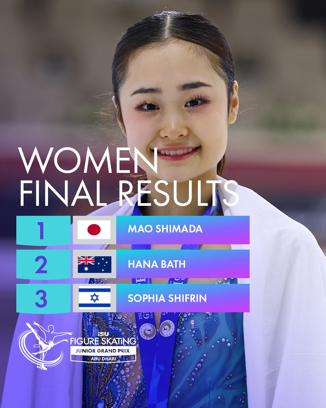 В Абу-Даби, на 7-м этапе Гран-при среди юниоров по фигурному катанию девушки разыграли свой комплект медалей турнира.Японка Мао Шимада (Mao SHIMADA) – завоевала золото, (201,17).
