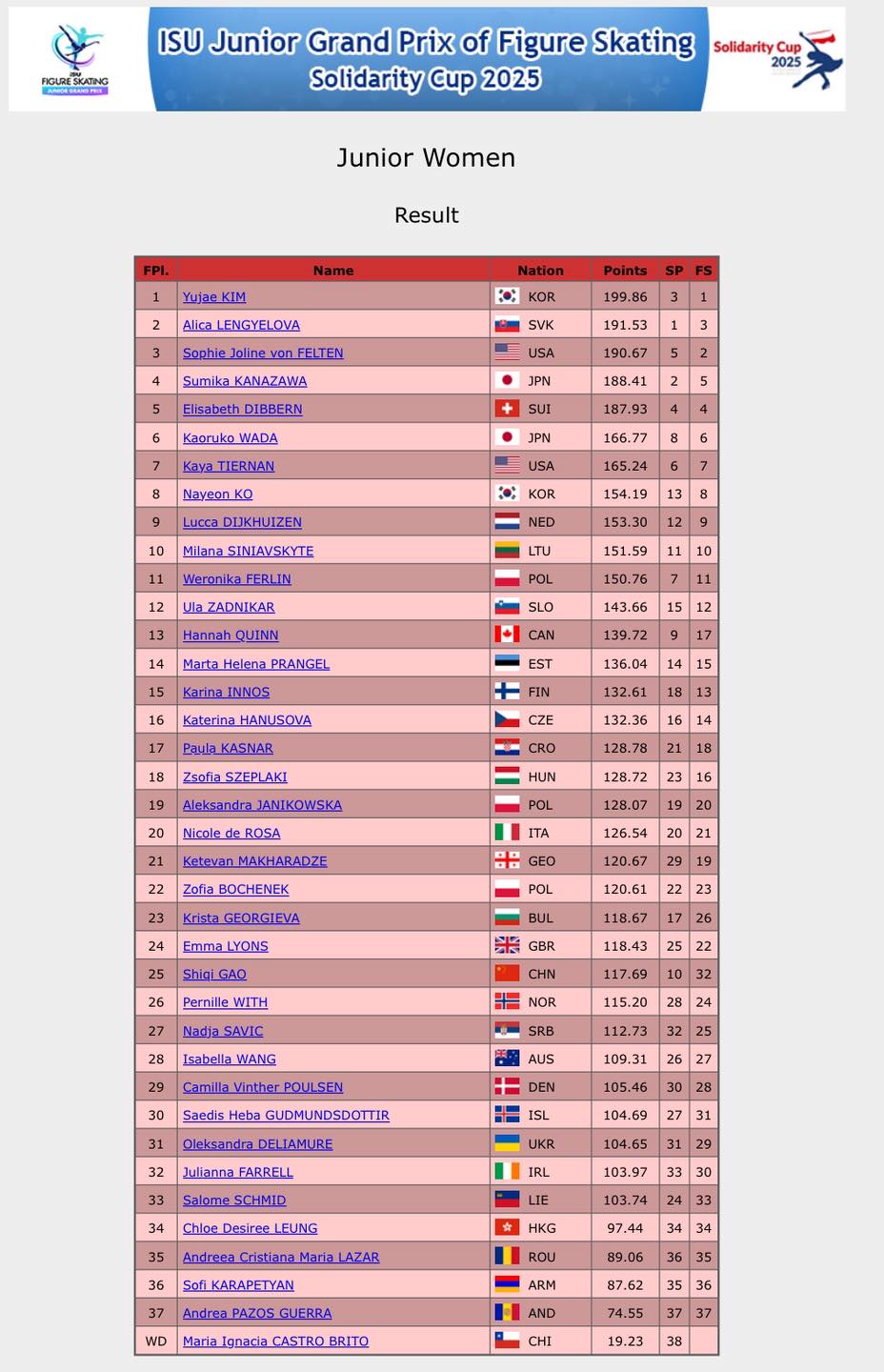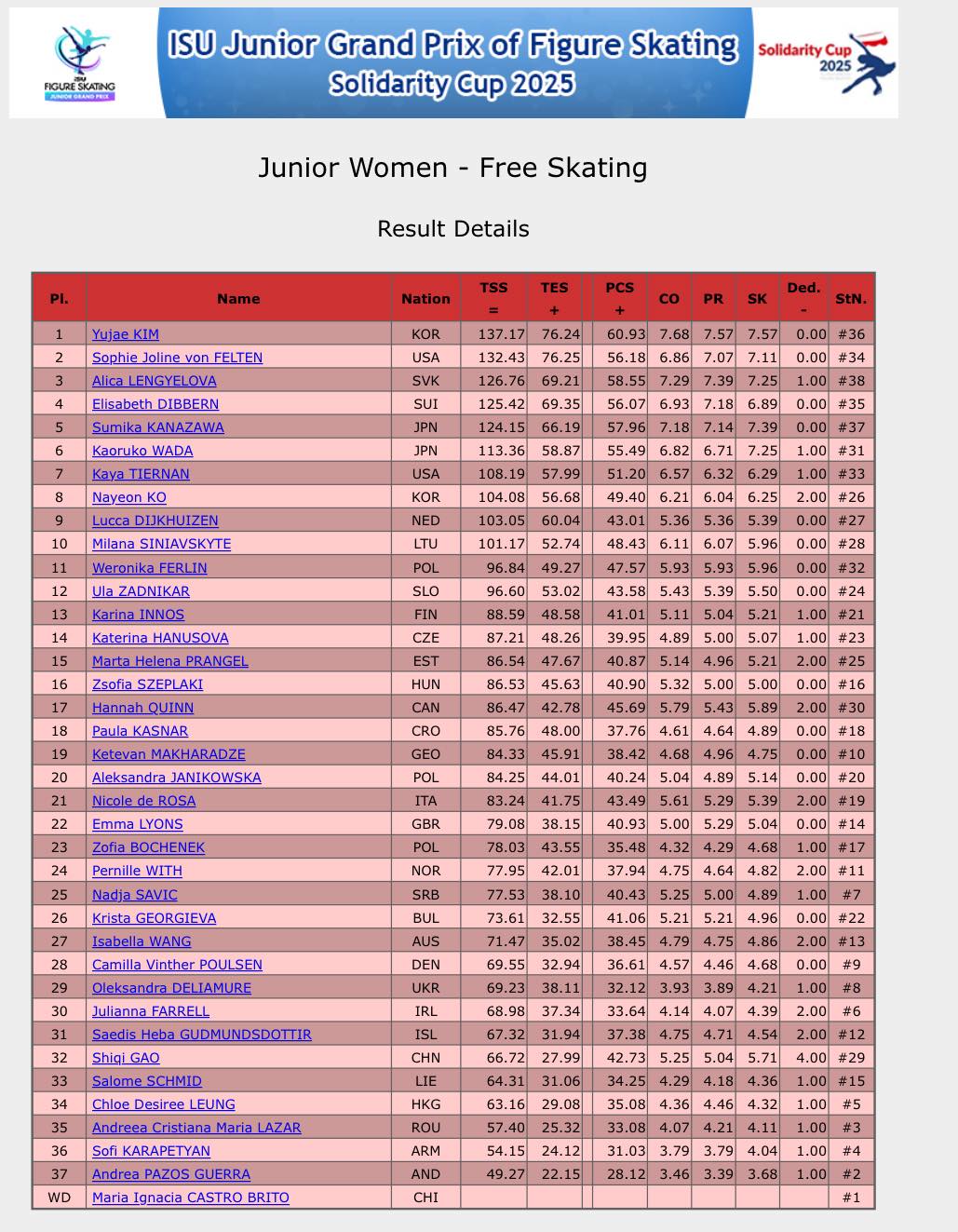 Американка Софи Джолин фон Фельтен (Sophie Joline von FELTEN) – с бронзовой медалью на третьем месте, (190.67). Несмотря на то, что у Софи в произвольной программе был самый сложный набор элементов ультра-си: два трикселя (3А), один из которых в каскаде и четверной сальхов (4S), пятое место в короткой программе не дало по сумме баллов занять более высокое место. Впрочем, к сожалению, не только ей.