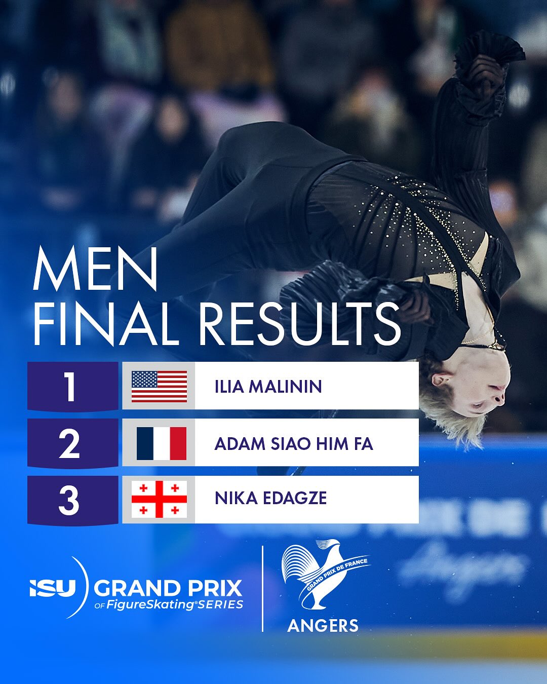 Американец Илья Малинин (Ilia MALININ), стал обладателем золотой медали, победив на 1-м этапе Гран-при по фигурному катанию Grand Prix de France во французском Анже, (321.00 ).