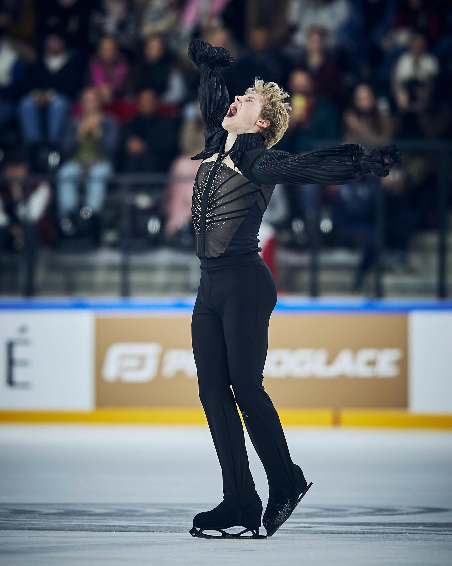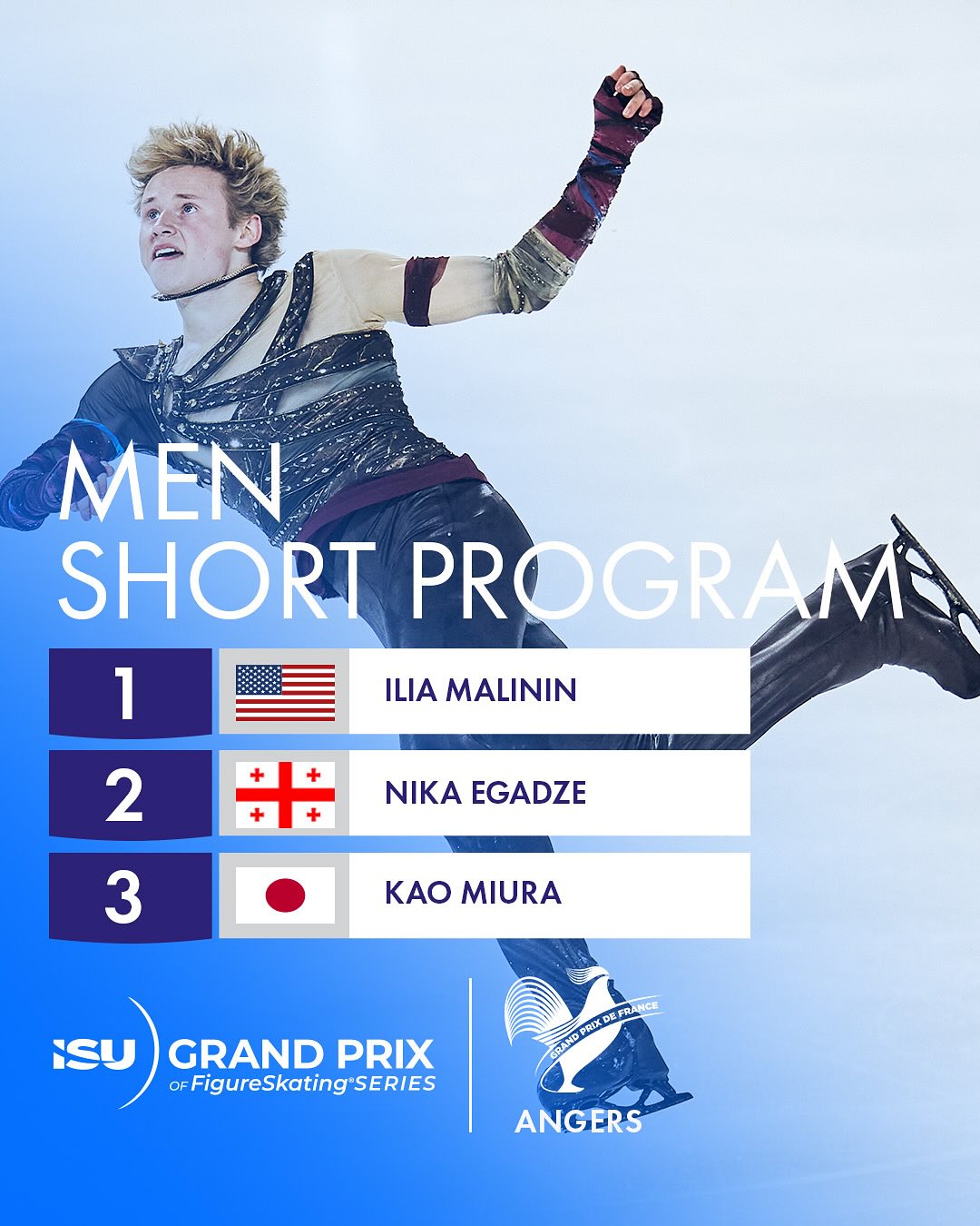 После проката короткой программы среди мужчин на 1-м этапе Гран-при по фигурному катанию Grand Prix de France во французском Анже лидирует американец Илья Малинин (Ilia MALININ), (105.22). Невозможно не восхищаться прокатом Ильи, это всегда очень сложный контент (4F, 3A, 4Lz-3T), плюс сальто в дорожке, да и программа ему очень идёт!