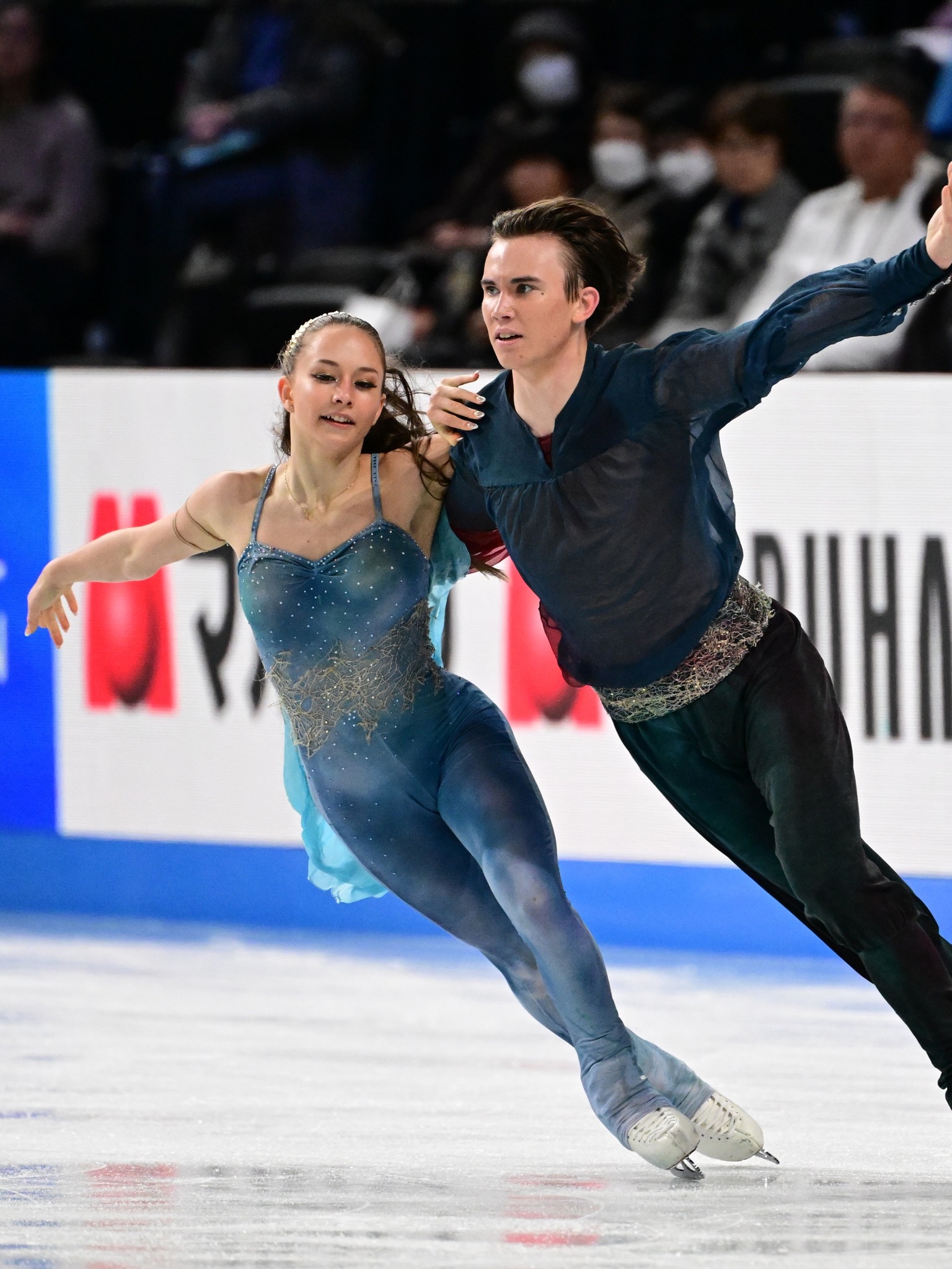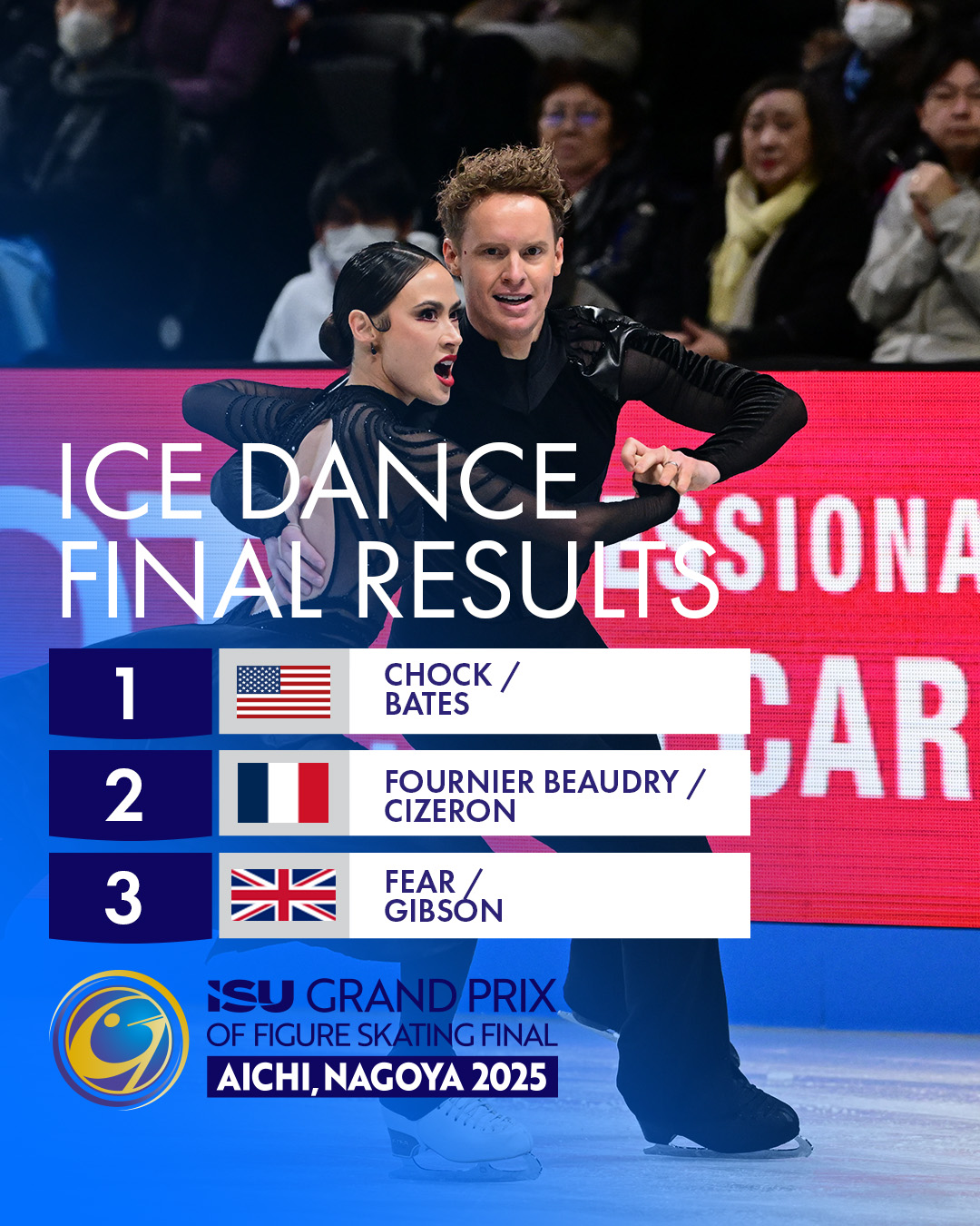 Американские фигуристы Мэдисон Чок и Эван Бейтс (Madison CHOCK/Evan BATES) завоевали золото турнира, одержав победу в танцах на льду среди взрослых в финале Гран-при в Нагое, (220,42).
