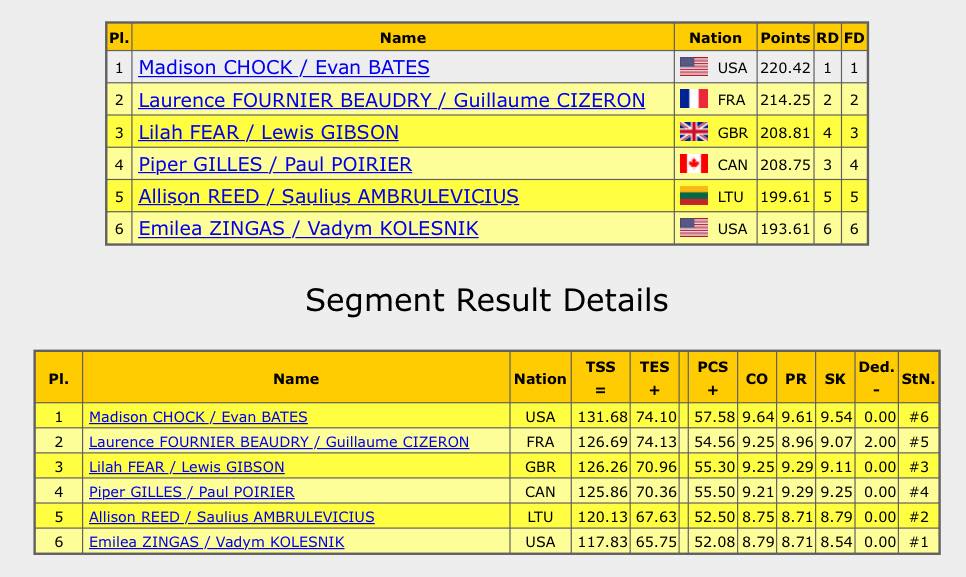 Главная интрига турнира в танцах на льду – это первое очное противостояние французского дуэта Лоранс Фурнье-Бодри – Гийома Сизерона и американского в лице трехкратных чемпионов мира Мэдисон Чок и Эвана Бейтса. Оба дуэта занимали первые места на двух этапах.
