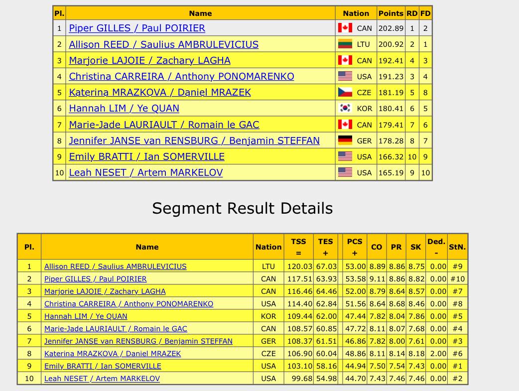 Канадский танцевальный дуэт Пайпер Гиллес – Поль Пуарье (Piper GILLES / Paul POIRIER) лидирует после ритм-танца на 3-м этапе Гран-при в Саскатуне, Канаде, (85.38).