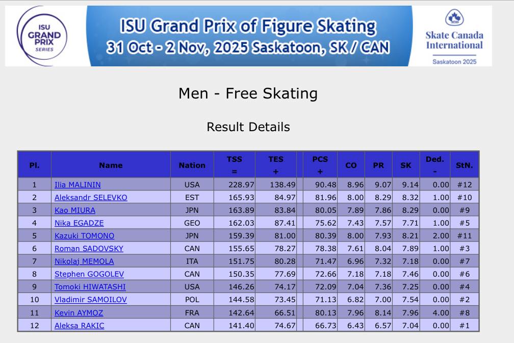 Американец Илья Малинин (Ilia MALININ) победил на 3-м этапе Гран-при в Саскатуне, Канаде, (333.81).