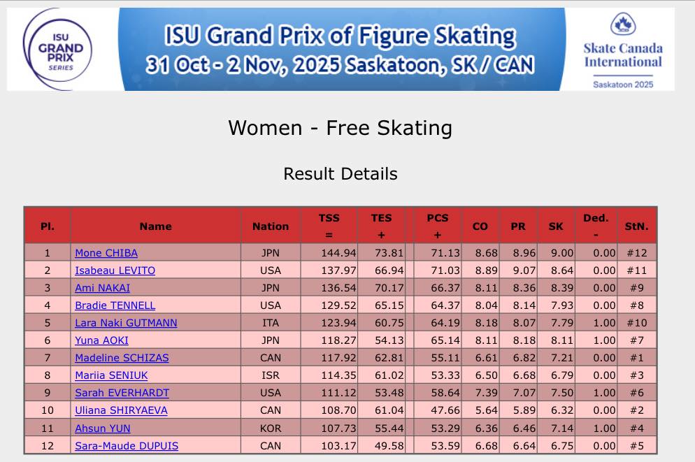 Японка Моне Чиба (Mone CHIBA) выиграла короткую программу на 3-м этапе Гран-при в Саскатуне, Канаде, (72,29).