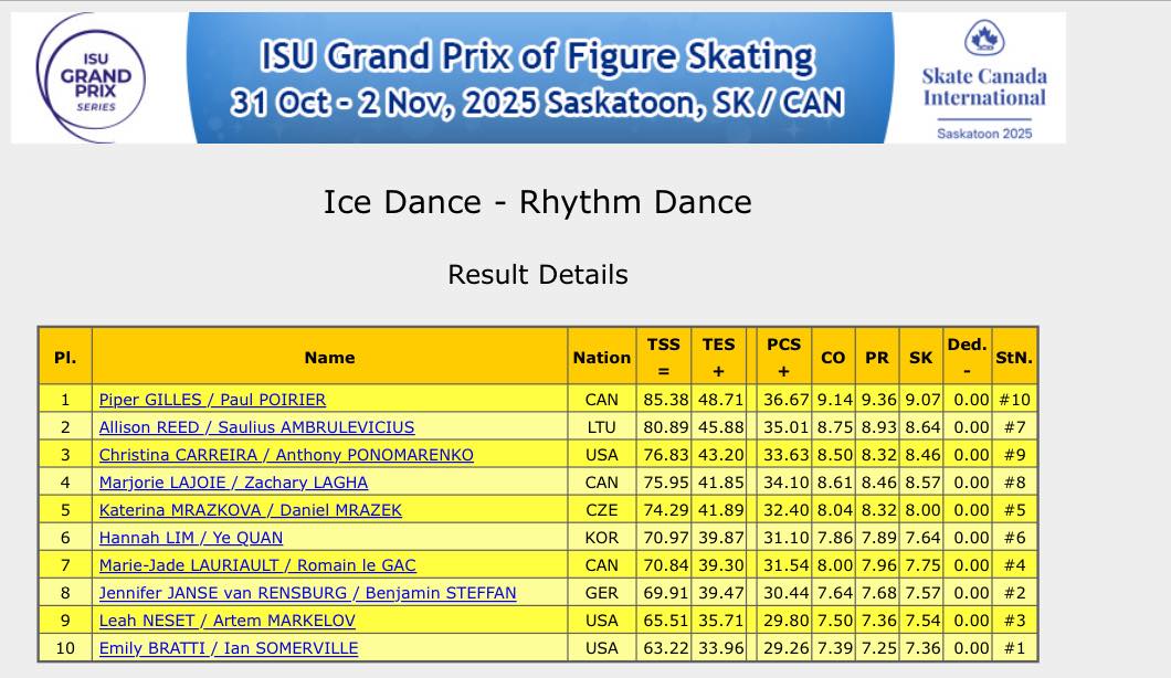 Канадский танцевальный дуэт Пайпер Гиллес – Поль Пуарье (Piper GILLES / Paul POIRIER) лидирует после ритм-танца на 3-м этапе Гран-при в Саскатуне, Канаде, (85.38).