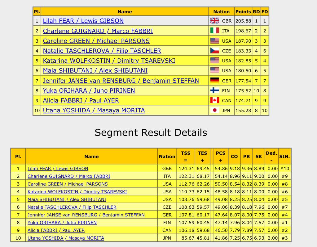 На втором месте итальянцы Шарлен Гиньяр и Марко Фаббри (Charlene GUIGNARD-Marco FABBRI), (198.67).