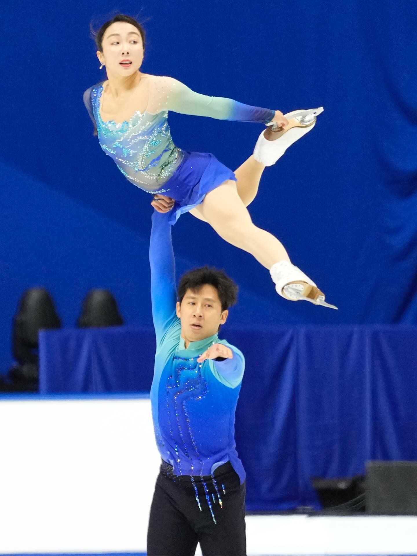 Китайская спортивная пара Вэньцзинь Суй и Цун Хань (Wenjing SUI / Cong HAN ) лидируют после короткой программы на 4-м этапе Гран-при NHK Trophy в городе Осака, Японии, (74.63).