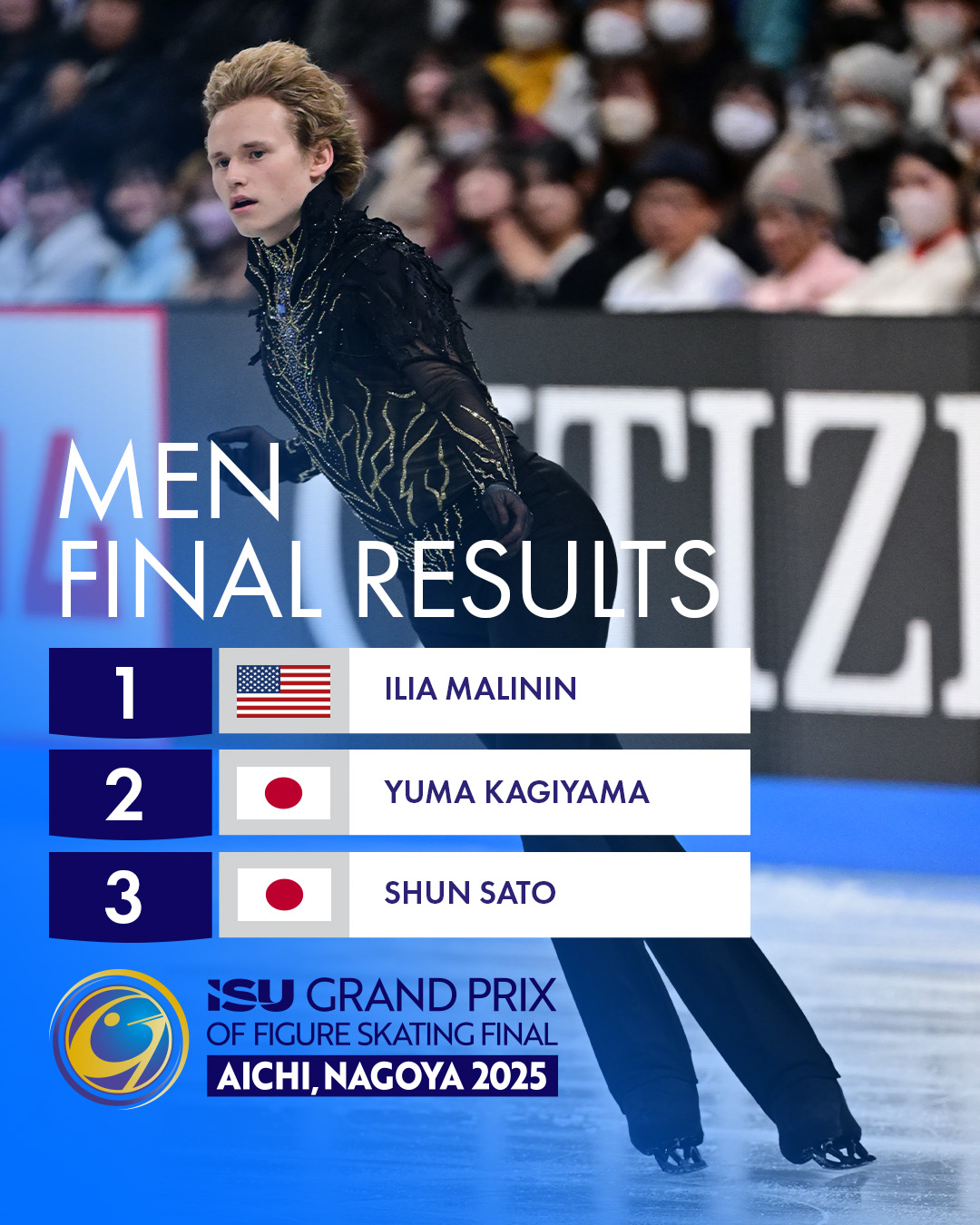 Американский фигурист Илья Малинин (Ilia MALININ) победил в финале Гран-при в исполнив произвольной программе семь четверных прыжков, (332,29). Илья Малинин стал первым в истории фигуристом, исполнившим семь четверных прыжков (4F, 4A, 4Lz, 4 Lo, 4Lz+1Eu+3F, 4T+3T, 4S+3A) и сальто в произвольной. За технику он набрал 146,07 балла, общая оценка за выступление – 238,24 балла. Это новые мировые рекорды.