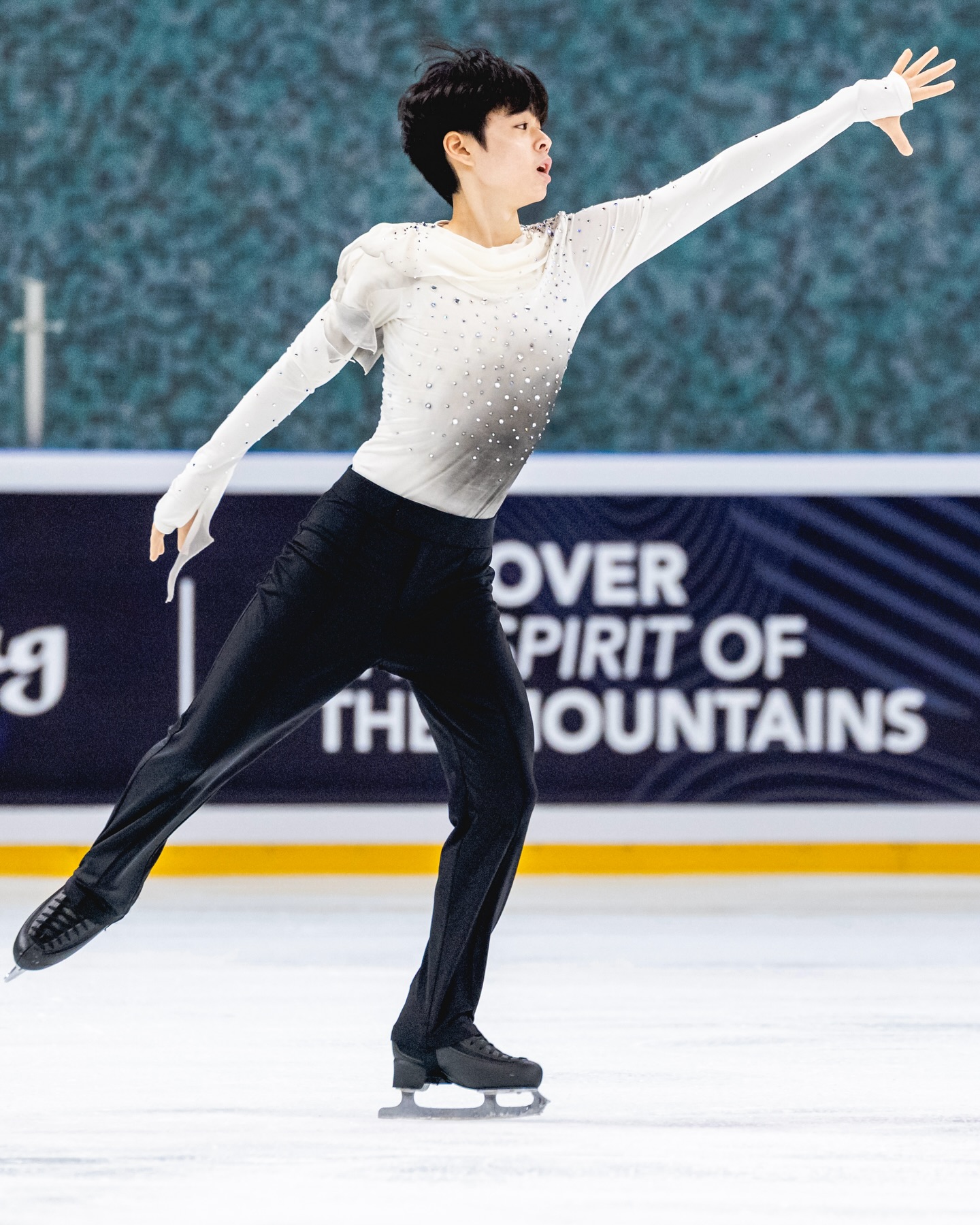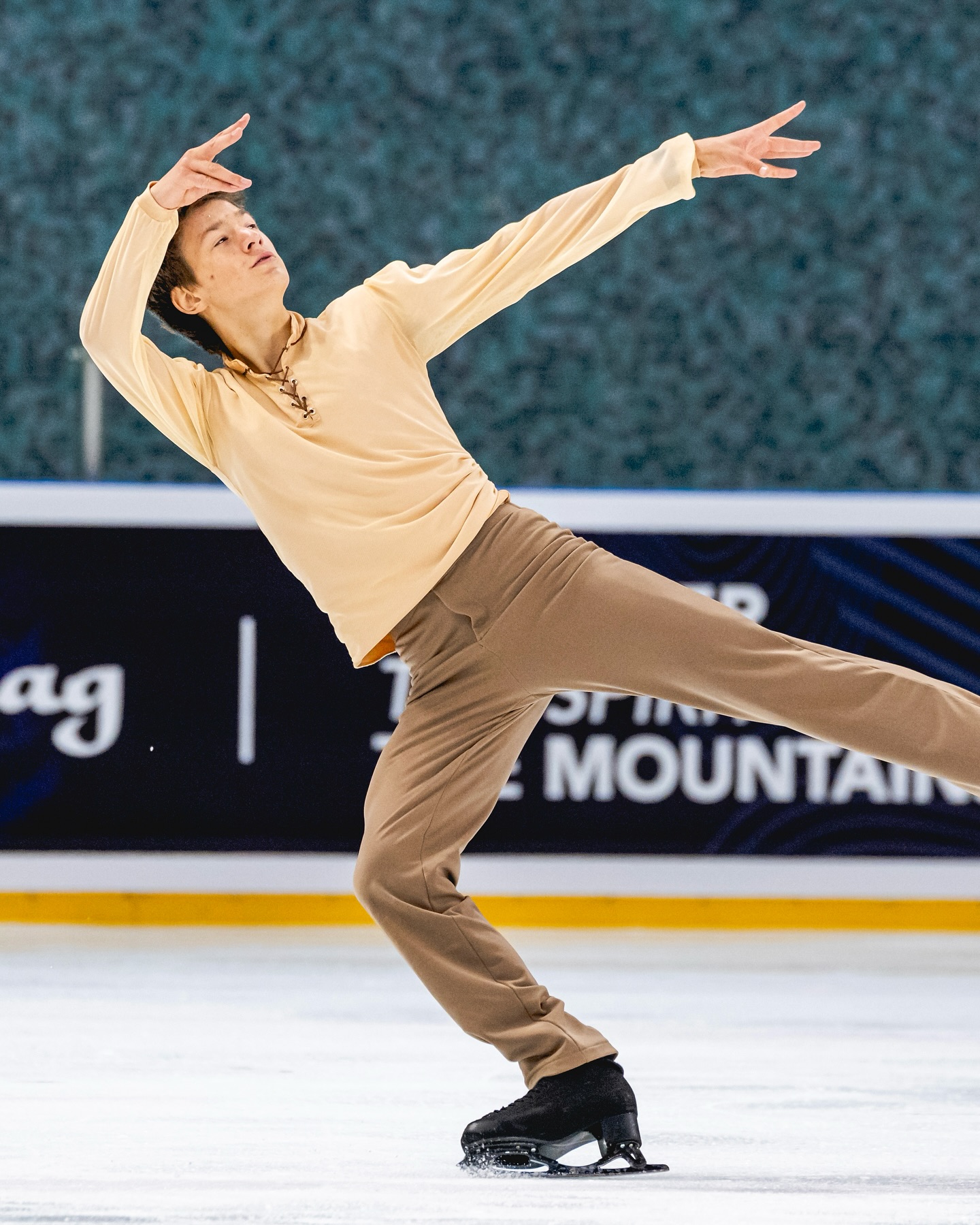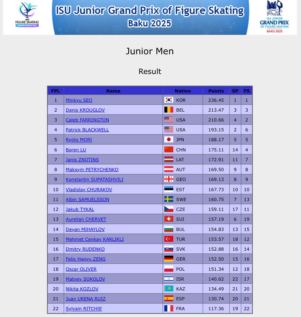 Фигурист из Бельгии Денис Круглов (Denis KROUGLOV) с серебром второй, (218,19). У Дениса из ультра-си был только триксель (3А), и в каскаде с лутцем второй прыжок только в 2 оборота (3Lz+2T), но на фоне остальных участников он оказался лучше, и смог подняться с 3-го места после короткой на вторую ступень пьедестала.